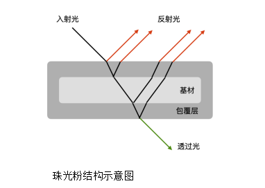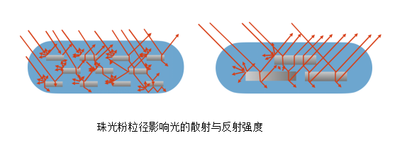 对于使用同一种基材的珠光粉,粒径分布是调控其光学效果的关键参数。当珠光颜料粒径较小时,光散射效应增强而反射减弱,呈现出较低的光泽度和较强的遮盖力;反之,当颜料粒径增大时,光散射效应减弱而反射增强,因而展示出高闪烁、高光泽、低遮盖力的特点。